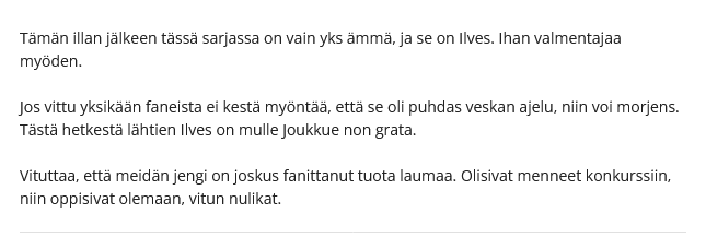 Varmaan uin vastavirtaan, mutta mielestäni tää ei ollut niin paha tappio. Tasotus olis pitänyt ehdottomasti naulata kolmosen paikoista, niitä oli kyllä. Siinä sentään vähän yritettiin. Yv perus lammas.