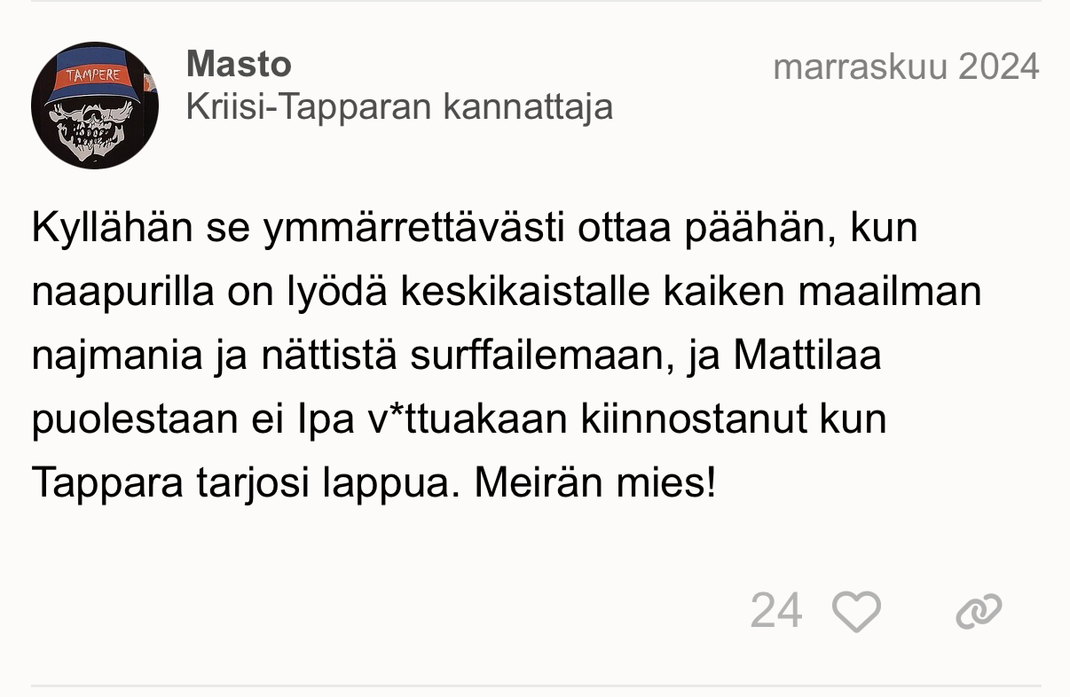 Itsellä on niin paljon kavereita molempien jengien kannattajissa ettei pysty mitään vihaa kokemaan. Jos Tappara on vastassa niin kentällä turpaan. Jos Tappara olis joukkue joka tiputtais pleijareissa niin kyllähän siinä extra-vitutus silloin iskisi, mutta jos ne on finaaleissa ja Ipa tippunut jonkun muun joukkueen takia, niin eipä oo Tapparan menestyksellä mitään merkitystä suuntaan tai toiseen.