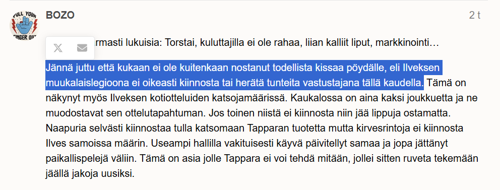 Onhan se ymmärrettävää joo, että tapparalaiset tulevat halliin katsomaan Ilvestä ja tämän kauden Ilves nyt ei heitä niin kiinnosta.