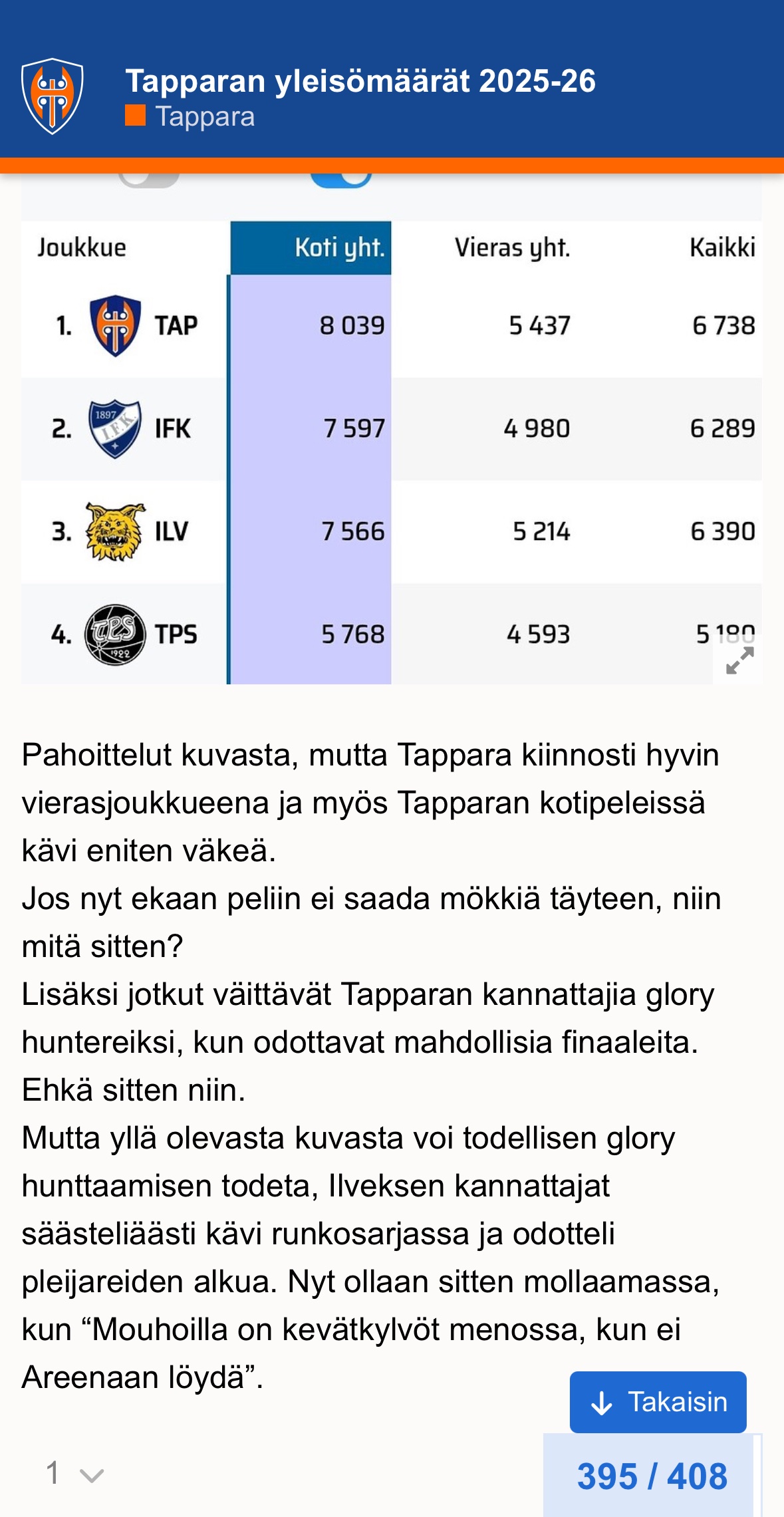 Seurat voisivat kesällä istua alas ja pohtia missä on mennyt pieleen kun ei keväällä onnistuta myymään paikallissarjaa loppuun. Meidän leirissä on aika vahvat mielipiteet Tapparan isännöimistä otteluista ja se että pitäisi vielä maksaa extraa vs kotipelit niin on aika vaikea saada meitä liikkeelle. Varsinkin kun ainakin itse koen etten ole varsinaisesti tervetullut mitä Tapparan toimistoon tulee.Todella nolohan tuo yleisömäärä on, vaikka selittelisi mitä. Joo, rahat on tiukilla monella ja moni sellainen varmaan valitsee Ilveksen viikonloppupelin jne. mutta silti. Tapparastahan meikäläisten pitäisi olla kiinnostuneita, tuntuu todella oudolta ajatukselta katsoa että ketä Ilveksessä pelaa ja todeta että "jaa, emmää sitten."![]()