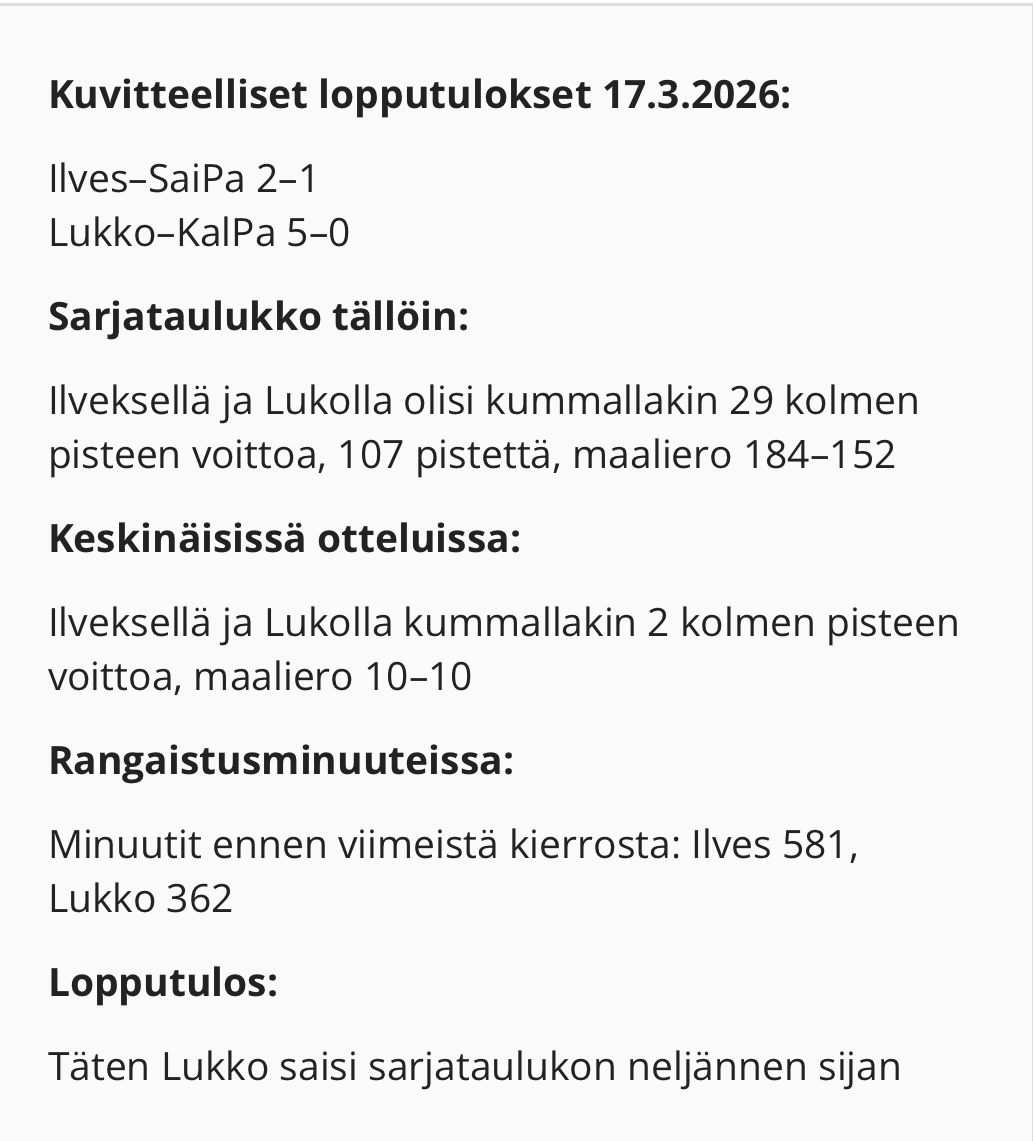 Toki nuo huonot tilastot johtuvat osin siitä, että hän joutui pelaamaan Ilveksessä kauden ensimmäisen neljänneksen. Tuolloinhan puolustuspelaamisessa tuli aivan järkyttäviä nukahduksia, eivätkä maalivahditkaan tosin niitä pystyneet paikkaamaan. Jos katsotaan tilastoja siitä alkaen, kun Armialis tuli, eivät Pavlatinkaan tilastot aivan surkeat ole. Ja nyt vuoden 2026 puolella Pavlat on itse asiassa päästettyjen keskiarvossa ja torjuntaprosentissa Armaliksen edellä. Ei maalivahdeissa siis ainakaan tilastollisesti ole suurta eroa. Se on sitten oma kysymyksensä, onko kumpikaan riittävällä tasolla. Mutta noin esimerkiksi päästettyjen keskiarvossa ei 2026 osalta ole kummankaan edellä yhtään Tapparan, KooKoon tai SaiPan maalivahtia.