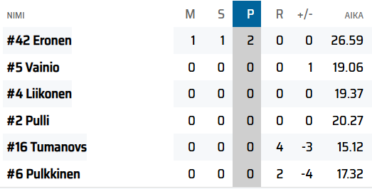 Huomasi tuossa Klingbergin maalissa eritoten. Latvala, siis Otto Latvala, menee heittämällä Torgerssonista ohi ja ei ehdi hippaa ottamaan kun syöttää jo Gazdalle ja ohessa oli paras yritys mitä mies enää pystyi tekemään syötön Klingbergille estämiseksi:Hieman vähän vajaa kaksi erää JYP pelasi ihan ok. Sen jälkeen loppui traktorista veto. Oikeastaan hyvin samanlainen ottelu kuin edellinen kerta Ilveksen vieraana.