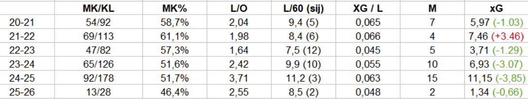 Ilveksen hyökkääjien maaliodottama on tällä kaudella -11 negatiivisen puolella, kun tyhjät maalit poistetaan tuosta liigan tarjoamasta tilastosta. Viime kaudellakin alisuoritusta tuli päälle kolmen verran, jos taulukkoni on ajantasalla. -3 ei kuulosta hirveän pahalta, mutta kollektiivisessa mielessä tuossa on ehkä hivenen helpompi yli- kuin alisuorittaa. Pakit ylisuoritti viime kaudella viidellä. Haatanen puolestaan on ylisuorittanut urallaan kuuden maalin verran ja ainoastaan kaudella 21-22 mies on jäänyt negatiivisen puolelle tuossa. Nykyjoukkueesta kun katsoo vaikkapa Ratisen ja Björkqvistin lukemia niin he löytyvät sitten vastaavanlaisesti toisesta päästä taulukkoa koko liigan otannalla ja heidän erikoistilannepanos on kokonaisuudessaan myös aika niukkaa. Haatasella on hyvä laukaus ja kyky tehdä maaleja vähän kaukaisemmaltakin etäisyydeltä. Tällaista vajetta meillä on mielestäni aika selvästikin hyökkäyksessä.