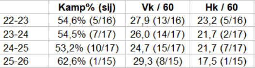 Jukureissa viime kaudella 5v5 peliaika 15:32, joka oli hieman liikaa tuolloiseen tasoon nähden ja pistetahti sillä saralla oli heikkoa, tällä kaudella vielä heikompaa. Tämän kauden ottelumäärä on toki niin pieni, että lukemat voivat heilahdella isosti - mihin tahansa suuntaan. Näistä vielä lisää tässä myöhemmin.