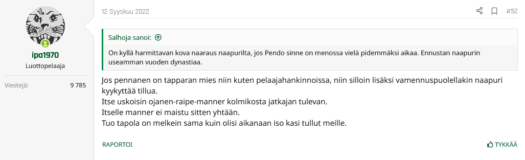 Loogisesti ajattelevat ihmiset ymmärtävät arvioida eri toimijoiden, kuten urheilujohtajan, onnistumista kokonaisuuden kautta, eikä niin, että kaikki kiteytyy mestaruuteen. Ei voi olla niin, että jokainen pleijaripettymys on sekä urheilujohtajan, valmennuksen että pelaajien vika. On täysin mahdollista, että tietyillä osa-alueilla hommia on hoidettu erinomaisesti siitä huolimatta, että keväisin on pettymyksiä koettu. Jotkut eivät tätä kokonaisuutta ymmärrä ja osalla taas on omat inhokkinsa, joihin kritiikki kohdistuu kaikesta riippumatta. Mitäpä tällaisten kanssa asiasta kinaamaan. Mikään ei sen myötä muutu.