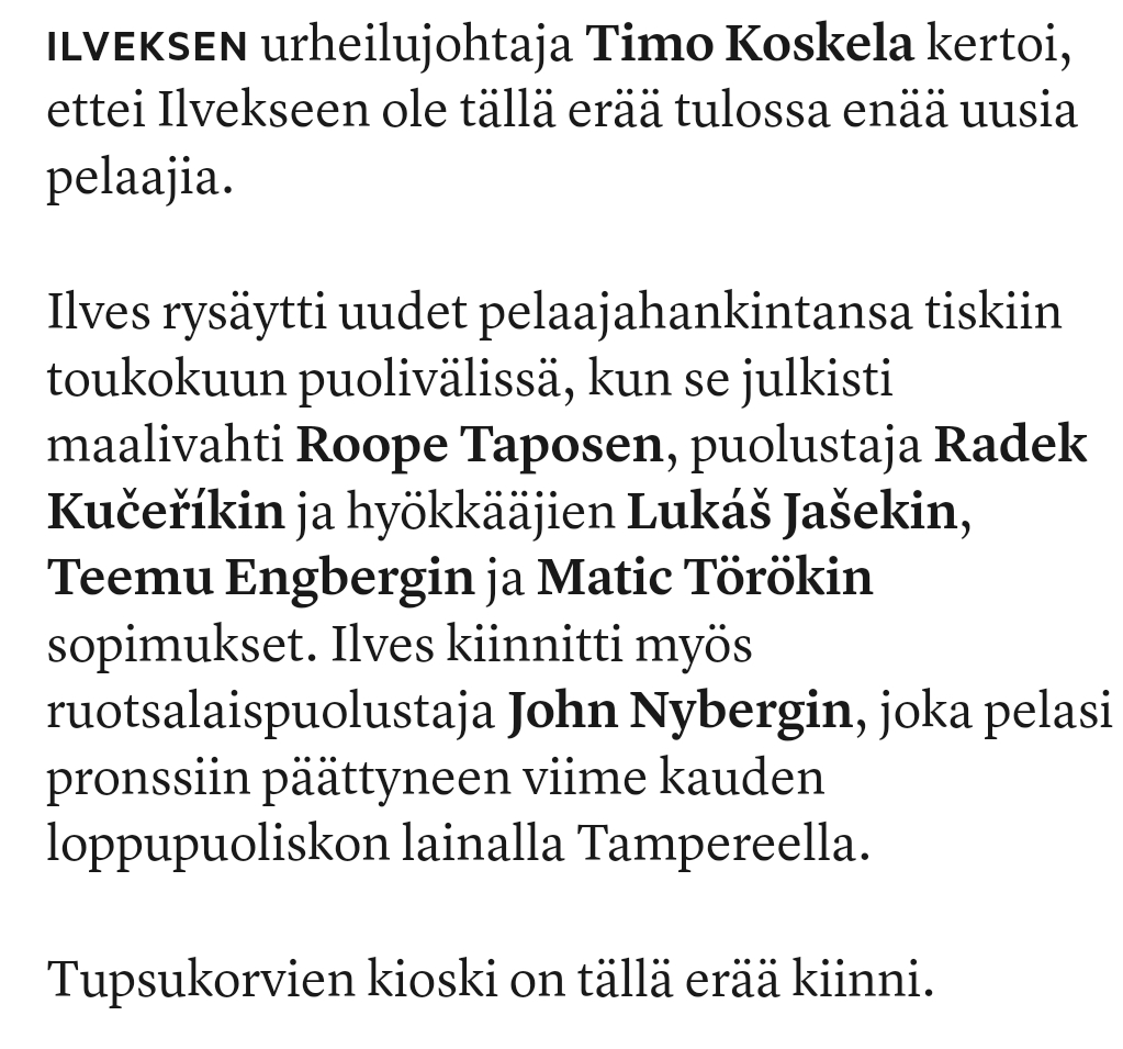 Muutenkin haluaisin, että tänne tulee pelaajia, joille Ilves on tulevalle kaudelle ykkösvaihtoehto, eikä vain ”vakuutus”.