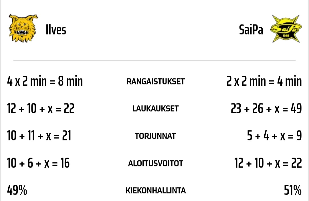 Siis missä ovat tänään Ilvestä huonompia? Taitaa kaikki tilastot mennä myös Saipalle? Paitsi maalit tasan. Sikäli niinkuin sanoin jos hyvän päätöserän pelaa voi se riittää tänään.