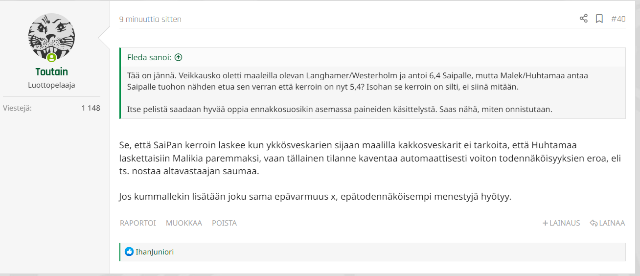 Kyllä Coolbetin jakauma silti kertoo asiasta jotain. Ei tuossa Veikkauksellakaan oo SaiPaa painettu niin, että kerroin laskenut sen takia. Coolbet on ihan kelpo saitti. Kyllä sieltä rahaa ehtii tehdä ennen kuin limitit paukkuu ihan naurettaviksi. Mutta joo, kuuluu niihin, jotka rajoittaa (lopulta).